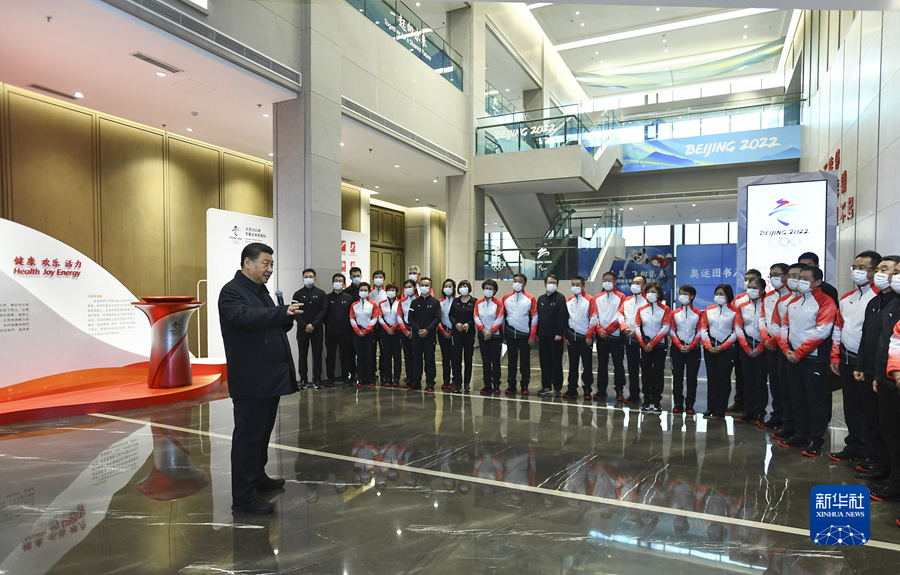 1月4日,中共中央总书记、国家主席、中央军委主席习近平在北京考察2022年冬奥会、冬残奥会筹办备赛工作。这是4日下午,习近平在二七厂冰雪项目训练基地速滑馆,向参训运动员、教练员表示慰问。新华社记者 谢环驰 摄