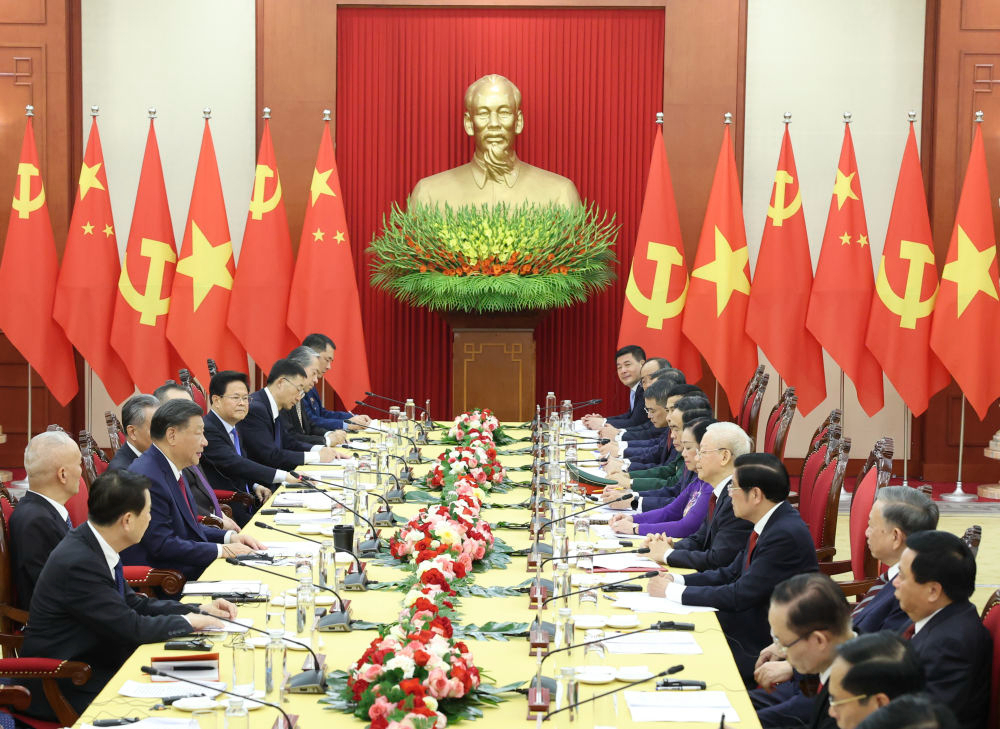 当地时间12月12日下午,刚刚抵达河内的中共中央总书记、国家主席习近平在越共中央驻地同越共中央总书记阮富仲举行会谈。新华社记者 申宏 摄