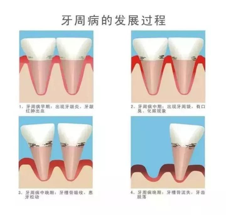 如果牙龈炎没有及时治疗,炎症可由牙龈向深层扩散到牙周膜、牙槽骨和牙骨质而发展为牙周炎。牙周炎早期症状不明显,容易被忽视。等到发现时,已经比较严重了,甚至必须拔牙。