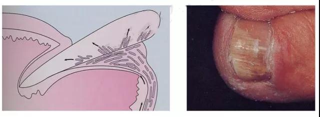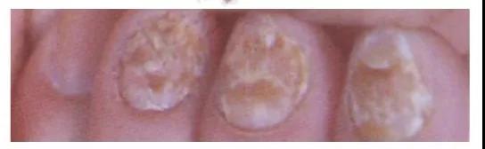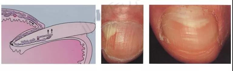 近端甲下型:由甲小皮而来,甲半月和甲根粗糙肥厚、破损。