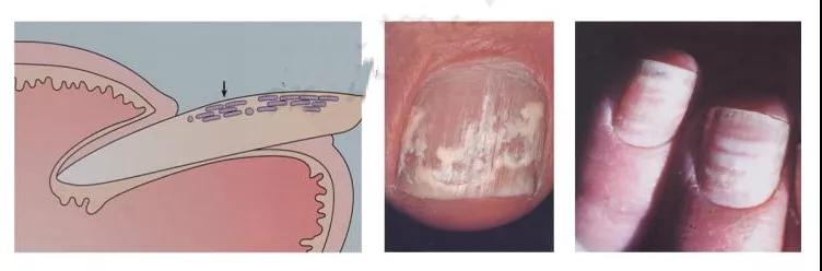 白色浅表型:真菌从甲板直接侵入,甲板浅层白色浑浊。