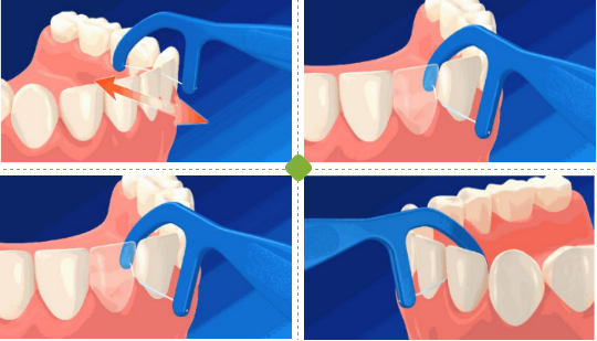 ★ 水平来回摩擦将牙线滑过牙面接触点,进入牙缝,注意滑过接触点后力度要轻。