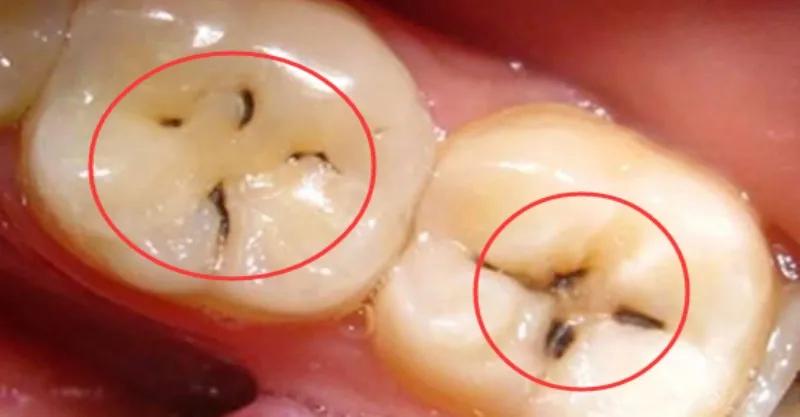 细菌在牙齿表面的窝沟中不断分解口腔中的糖产生酸,继而破坏牙齿,外表看起来只是一个小黑点或是黑色纹理,其实下面的牙齿早已受到比较严重的破坏,这就是所谓的“潜藏性龋”。这种小黑点是龋齿发生的早期阶段,越早处理越好。从初期的变色到最终形成龋洞,通常需要1年半到2年。在此期间,多留心自己的牙齿,完全可以把龋坏扼杀在萌芽阶段。