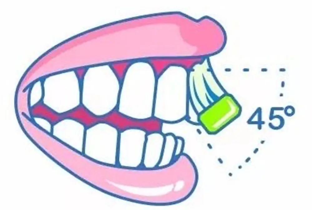 将牙刷对准牙齿与牙龈交接的地方,刷毛与牙齿大致呈45°角,同时将刷毛向牙齿轻压,使刷毛略呈圆弧,牙刷侧边与牙齿有相当大的接触。