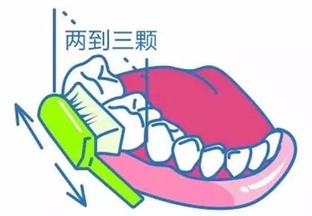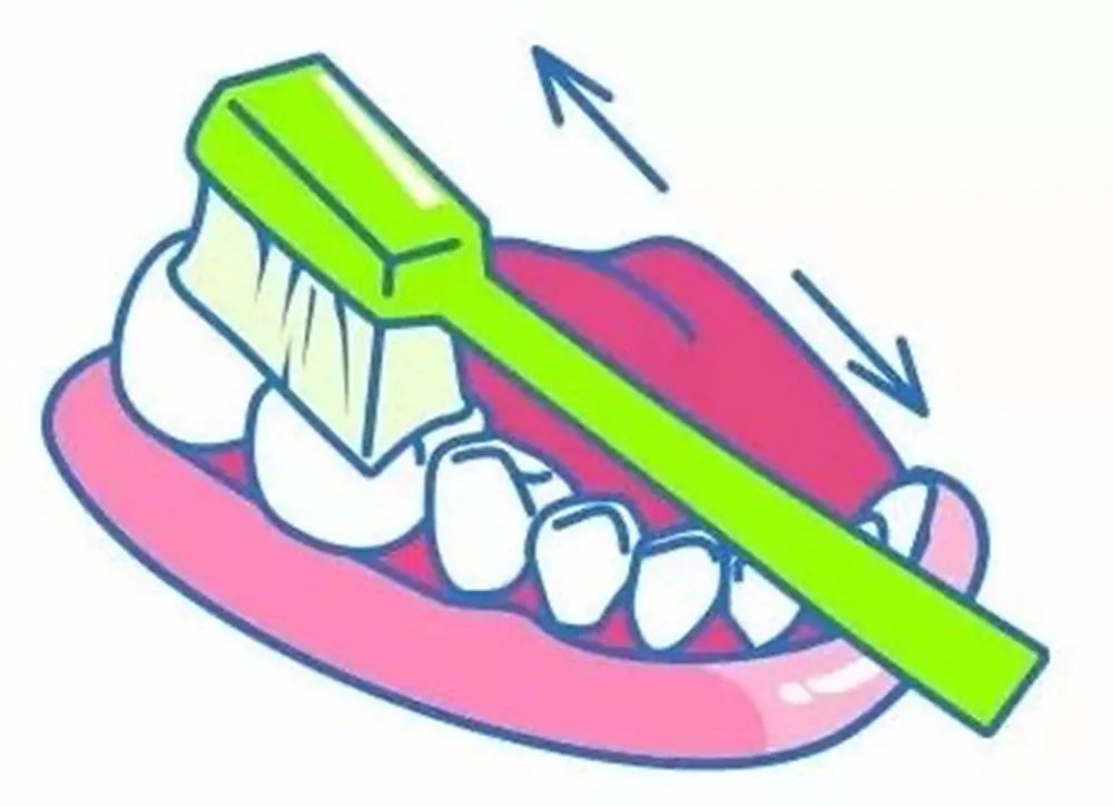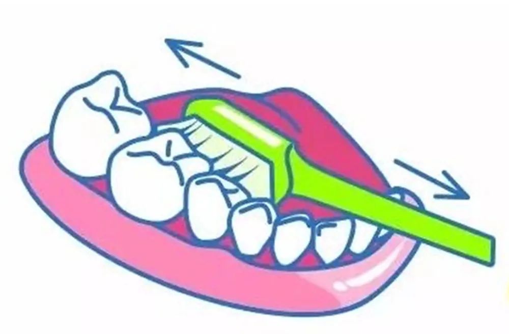 牙刷定位后,开始做短距离水平运动,两颗到三颗牙前后来回约刷10次。