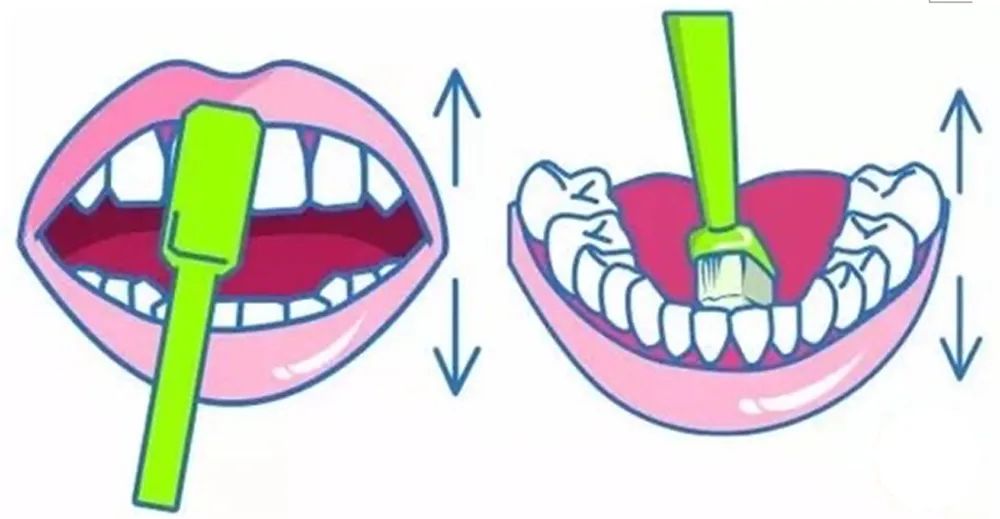 刷门牙的时候有点特殊,要把牙刷竖起来,一颗一颗上下来回刷,内外都要刷到。