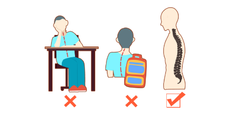 ◆ 坐立和行走姿势不正确,单侧肩背书包,歪着躯体写字等不良身体姿态,缺乏正确的脊柱健康教育。