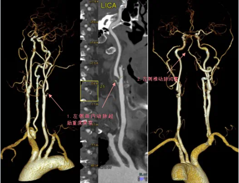 70岁的程爷爷,突然出现右侧肢体无力,右上肢勉强抬举,右下肢不能撑重,还有口角歪斜症状,到河北省第八人民医院(河北省老年病医院)就诊检查,医生了解病情后,随即为老人开具了头颈部CTA检查,检查结果显示程爷爷的左侧颈内动脉起始部重度狭窄,几近闭塞;左侧椎动脉重度狭窄,局部闭塞。