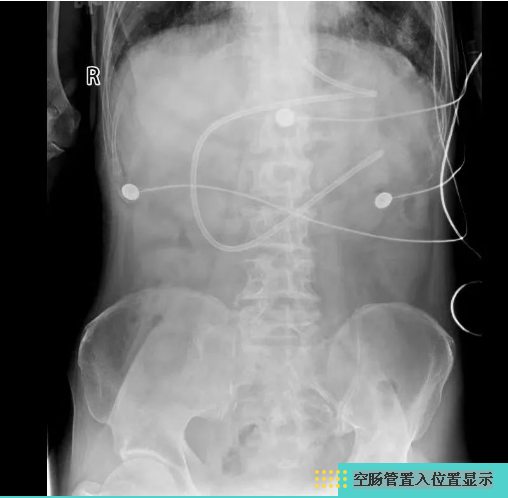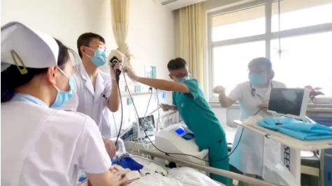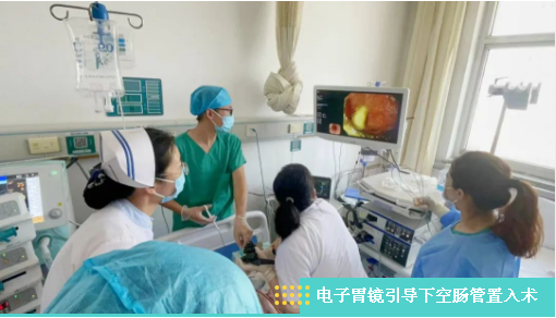 任冬飞医师在床旁为患者进行电子胃镜引导下空肠管置入术,引流出胃内容物并给予空肠营养支持