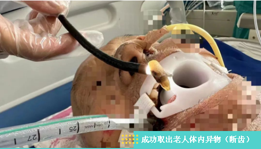 气管镜引导下,通过异物钳及网篮,成功取出老人体内异物(断齿)