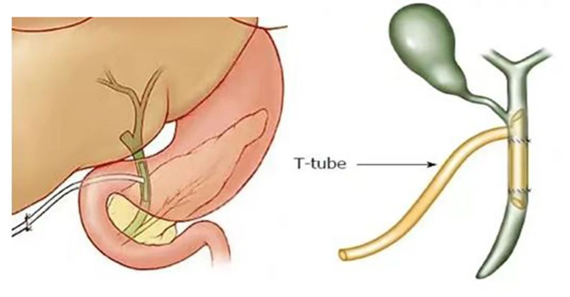 胆道手术患者,在胆总管切开处放置一根“T”形管,一端通向肝管,一端通向十二指肠,由腹壁引出体外,连接引流袋,用于引流胆汁。