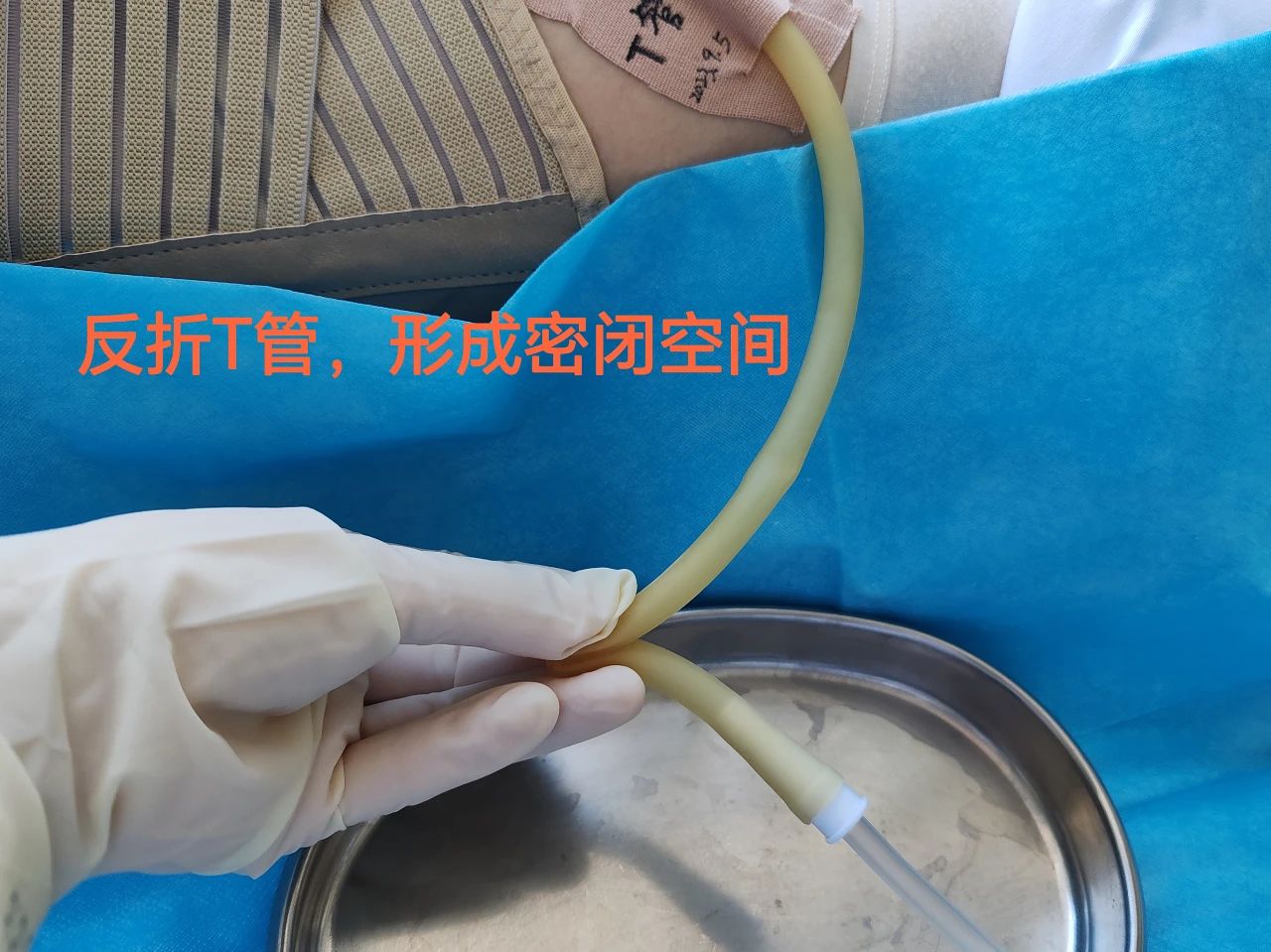 ◆ 戴手套,一次性垫单放于引流管下方,挤压引流管确认通畅,反折T管,形成密闭空间。