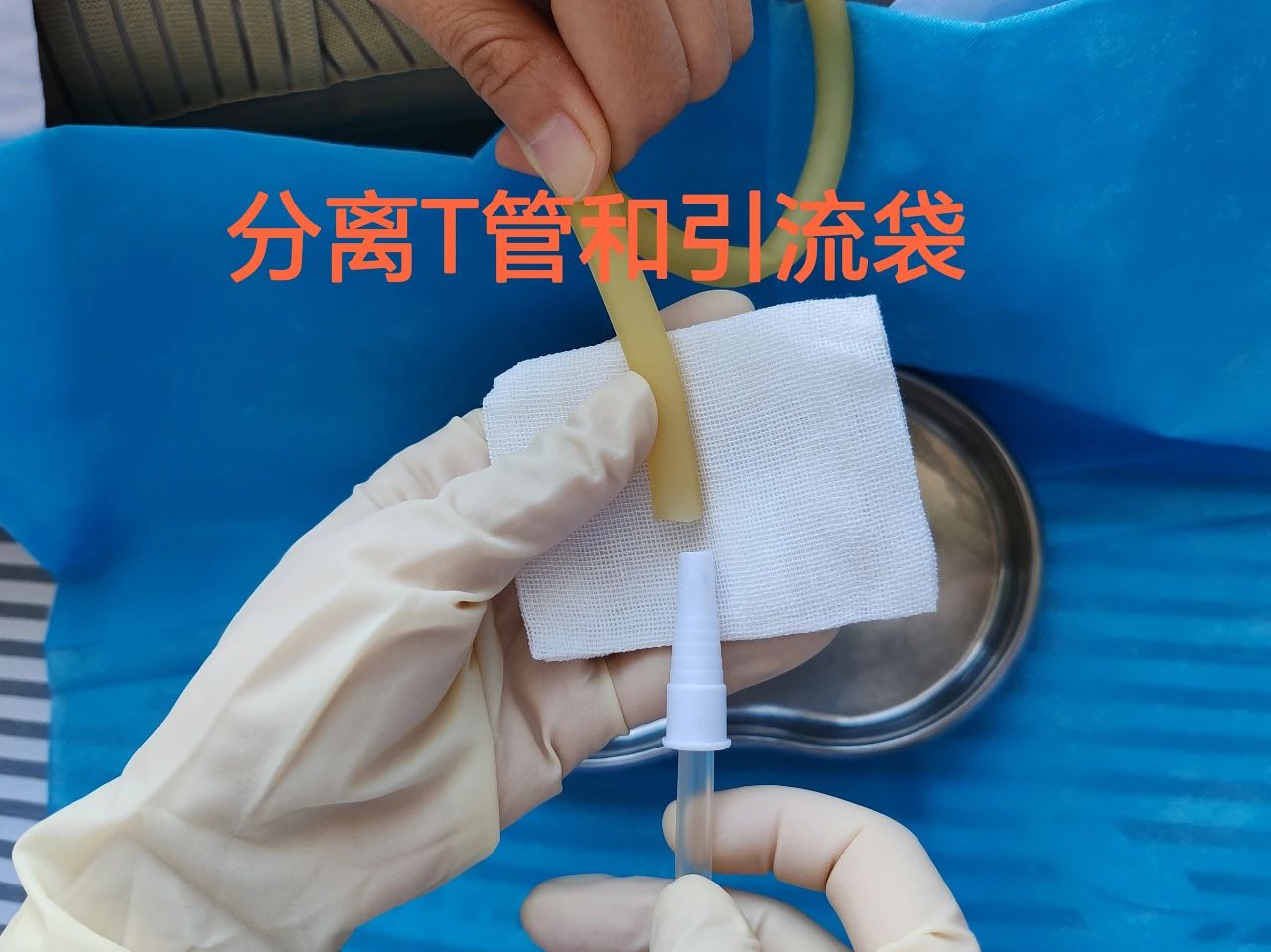 ◆ 分离T管和引流袋,拔出旧引流袋,分离时切勿用力。