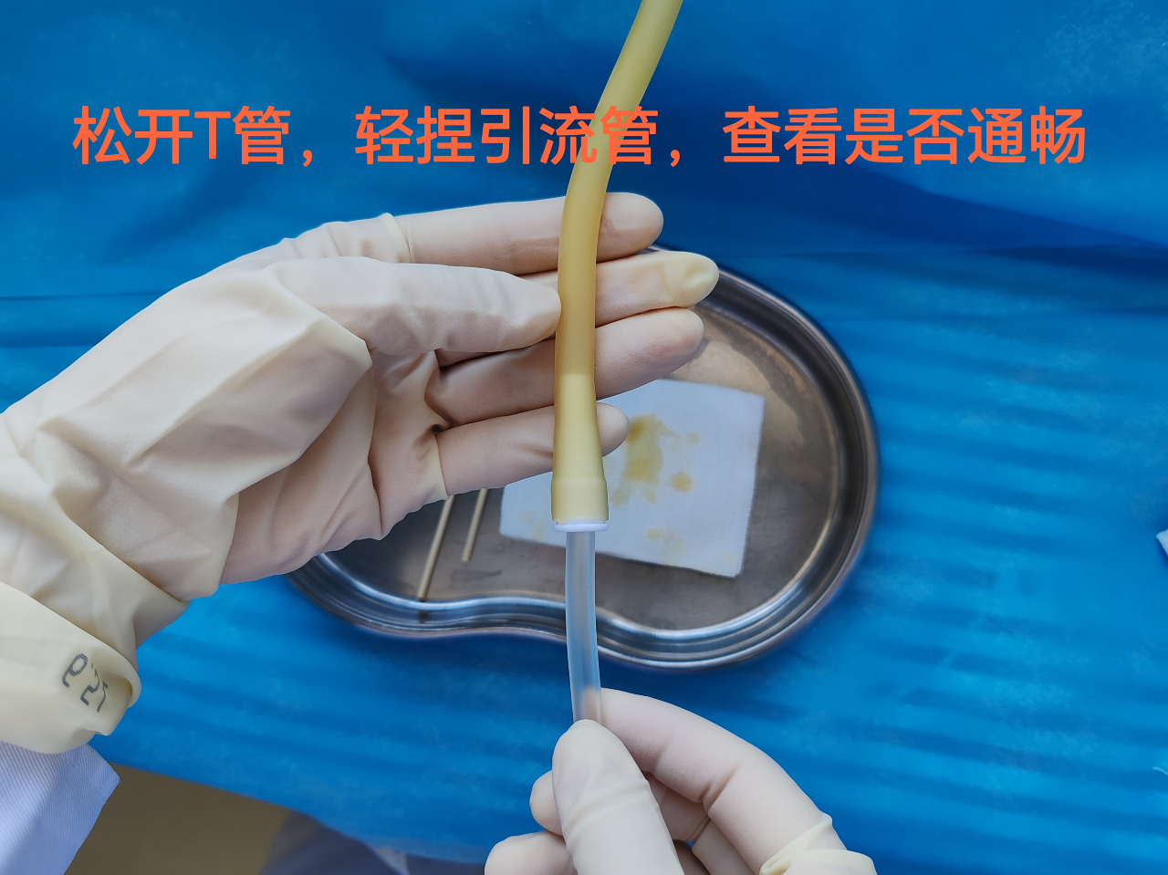 ◆ 松开T管,轻捏引流管,查看引流袋内是否有液体引出。