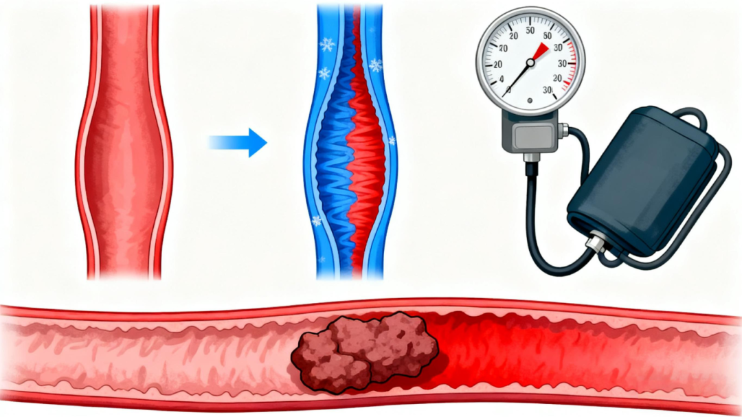 寒冷刺激导致血管收缩痉挛,血压波动增大,心脏负担急剧加重。
