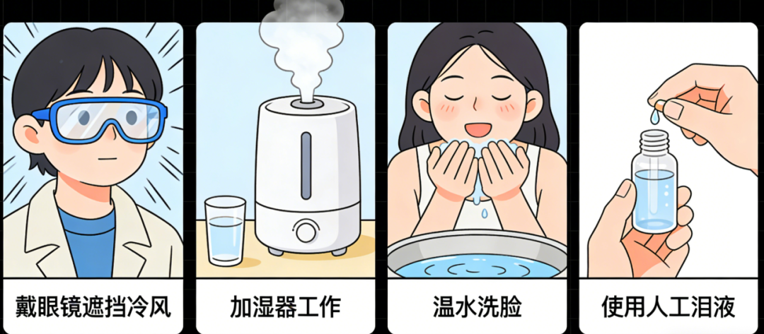 出门时戴上眼镜、太阳镜或护目镜,减少冷风直接接触眼睛。