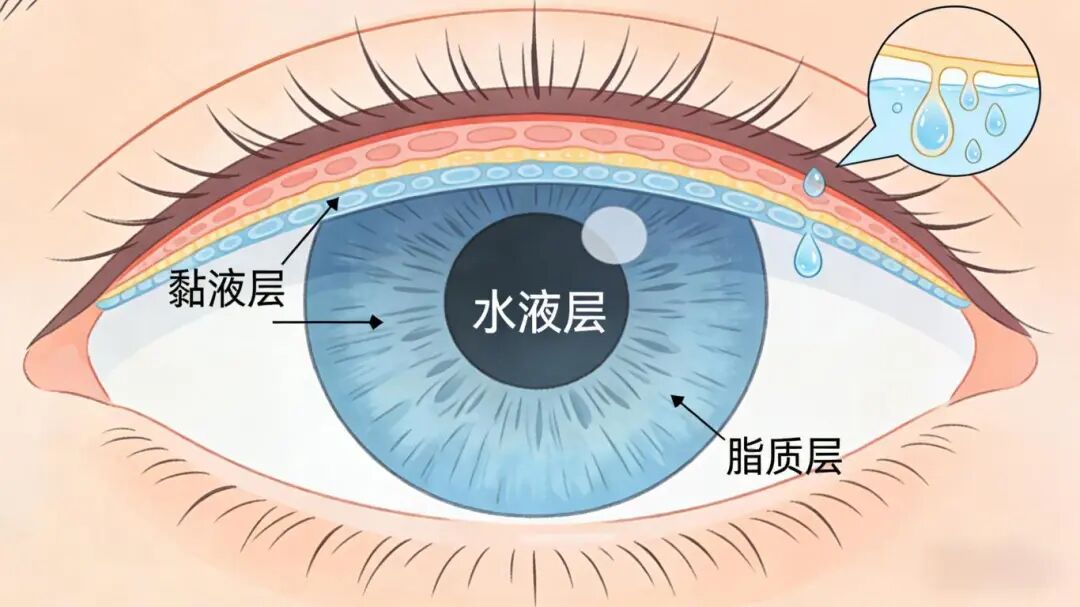 我们的眼睛表面一直覆盖着一层薄薄的泪膜,由三层组成:最内层的黏液层帮助眼泪附着在眼球上,中间的水液层提供水分和氧气,最外层的脂质层则防止水分过快蒸发。泪液由眼角的泪腺分泌,平时我们几乎感觉不到它的存在。