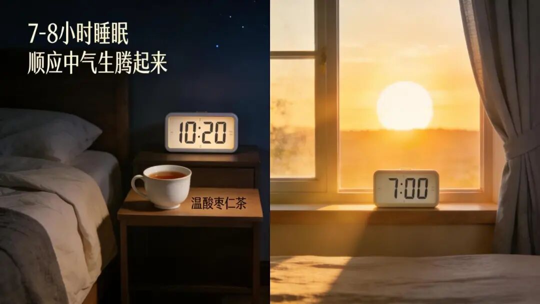 实操建议:尽量在晚上11点前入睡,早上7点左右太阳升起后再起床,保证7-8小时的睡眠。如果晚上容易失眠,可以试试睡前用温水泡脚15分钟,或者喝一杯温温的酸枣仁茶,帮助静心安神。