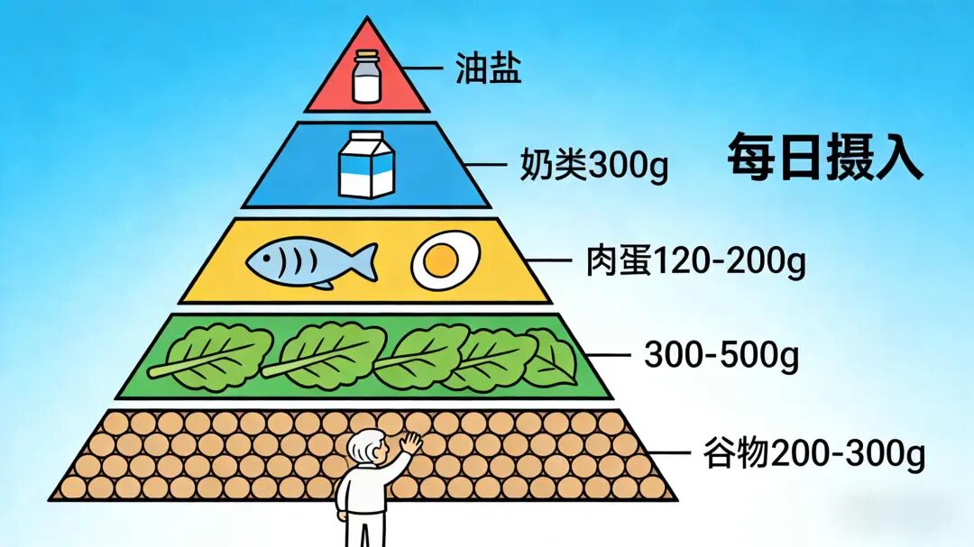 膳食对健康的影响是长期的,遵循量化标准、坚持平衡膳食,才能发挥营养价值。可借助“平衡膳食宝塔”自检:谷物200-300g/天、薯类50-100g/天、蔬菜300-500g/天、水果200-350g/天、肉蛋类120-200g/天、奶类300g/天。