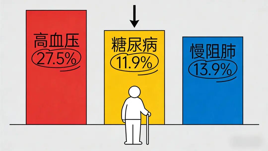 老年健康绕不开慢性病话题。《我国居民营养与慢性病状况报告》显示,老年慢性病患者群体持续扩大:18岁及以上居民高血压患病率27.5%,糖尿病患病率11.9%,40岁及以上人群慢性阻塞性肺病患病率13.9%。这些疾病既折磨患者身体,也给家庭带来沉重负担。