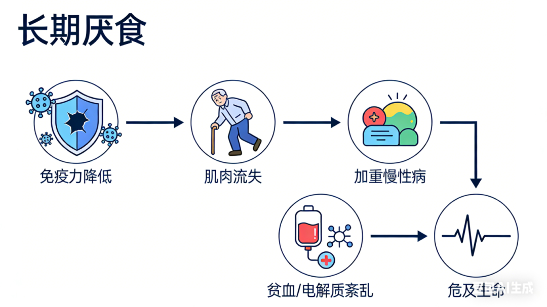 长期厌食可能把老人推向脆弱边缘。衰老本身就会带来生理储备下降,若再叠加营养不良,犹如雪上加霜: