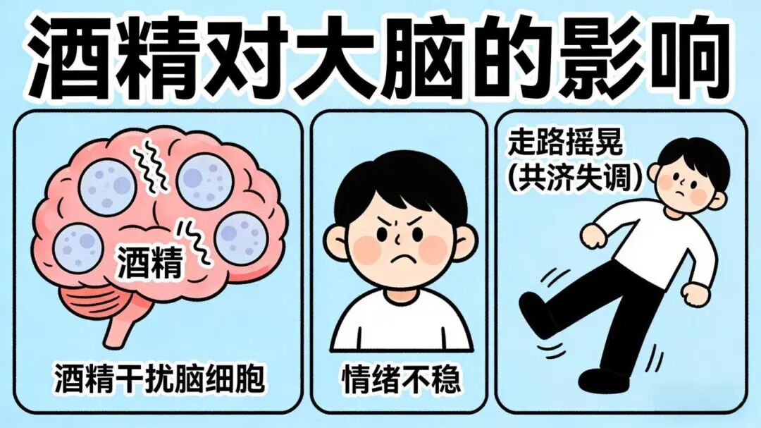 除了前边所述的脑部结构损伤,酒精还能够干扰脑细胞功能,导致情绪不稳,甚至引发酒精性脑病。长期饮酒还可能导致共济失调,严重影响生活质量。