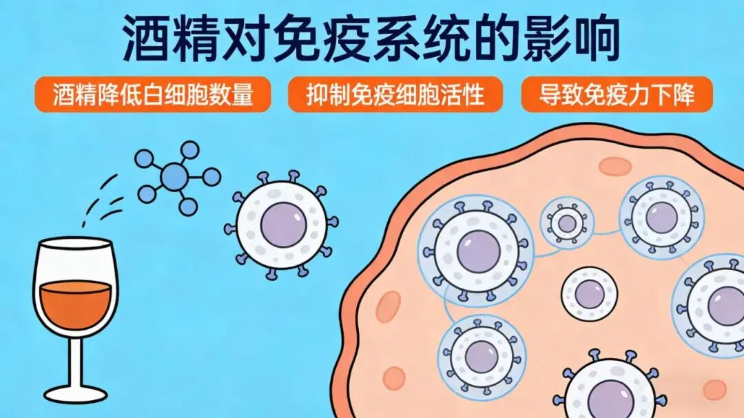 长期饮酒会降低白细胞水平,抑制T细胞发育,损害 NK 细胞攻击癌细胞的能力,从而使机体免疫力下降。