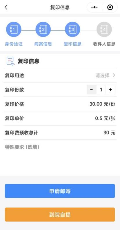 选择复印用途、份数;根据所需选择领取方式(邮寄或自提)并完成支付,复印费为预付,审核后多退少补。