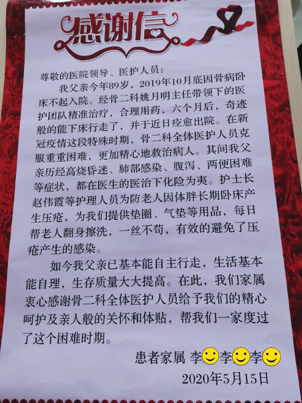 “老人不用天天躺床上了,也解决了老人出院在家护理的一大难题,我们受老人之托,给你们送来锦旗和表扬信,谢谢你们!”前几天,李爷爷的家人在他出院后再次来到医院,送来了锦旗和表扬信,“医德双馨、情系患者 、白衣天使、精心呵护”,简短的四句话,表达了一家人对骨二科全体医护人员的深深谢意。