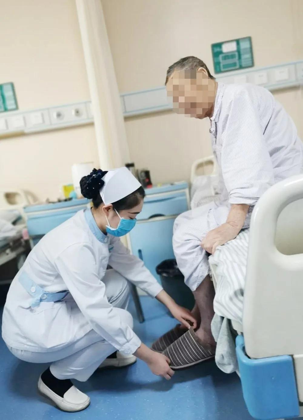 半年的时间里,李爷爷共间断住了三次院,第二次住院时,李爷爷就跃跃欲试想下床,每次查房,他就会主动地伸出腿让医护人员检查,还开心地说:“看!我的脚不肿了,自己在床上还能做你们教我的直腿抬高动作,是不是能下床了?”护士们协助老人在床边进行站立练习,还根据医嘱带老人借助骨质疏松治疗仪做治疗。