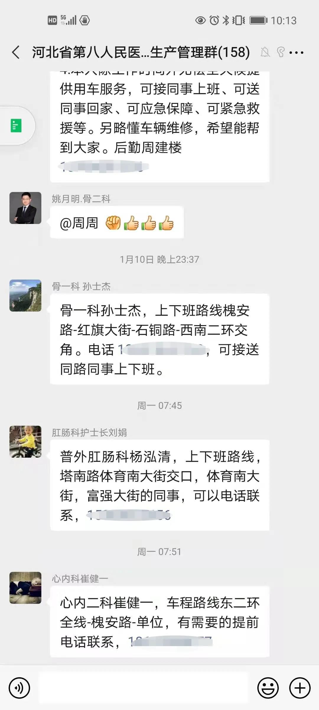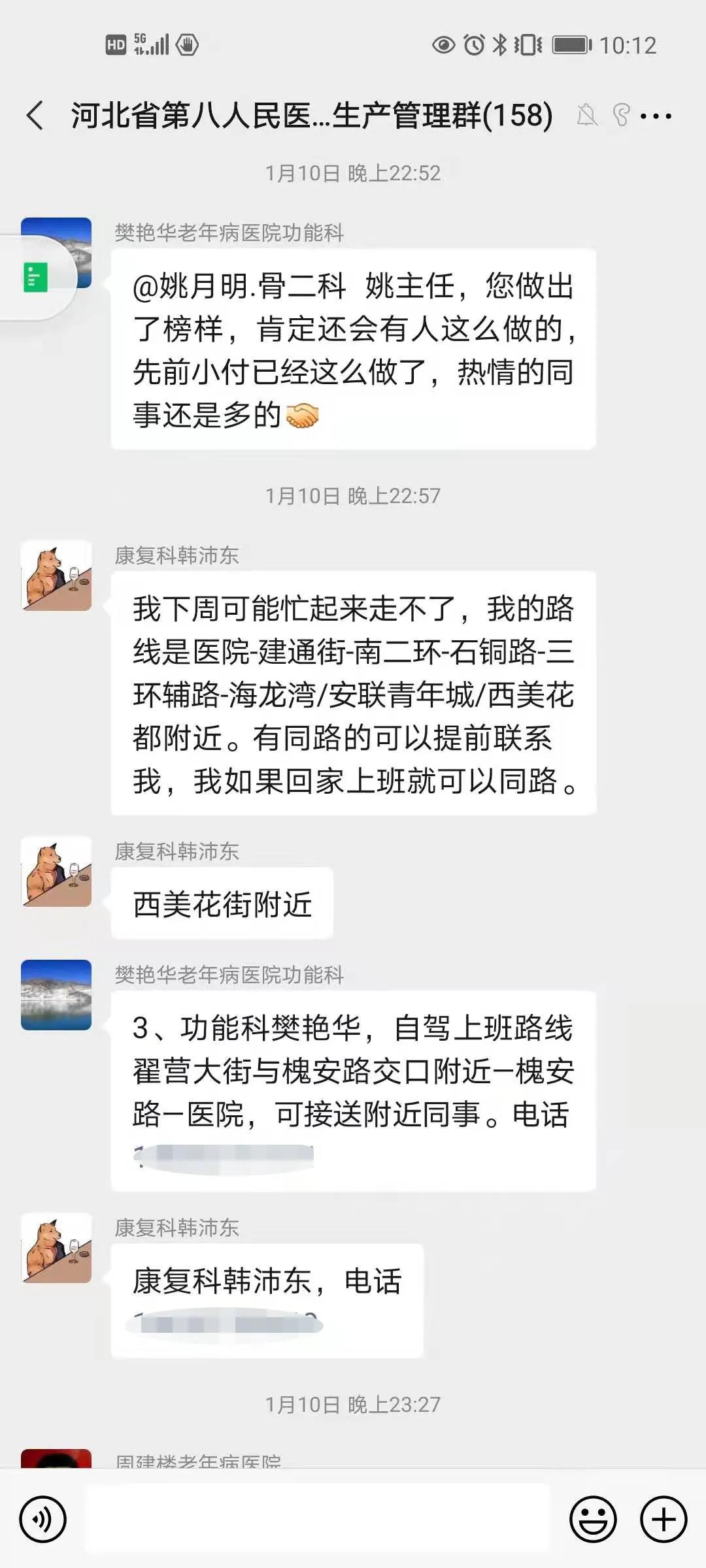 “疫情期间,我为大家提供用车服务,可接同事上班,可接同事回家,可应急保障,可紧急救援。另略懂车辆维修,希望能帮到大家。”院总务科周建楼刚发出这条微信,立刻在医院微信工作群引起反响,大家纷纷接龙,标出自己的上下班行车路线,表示志愿接送同事上下班。