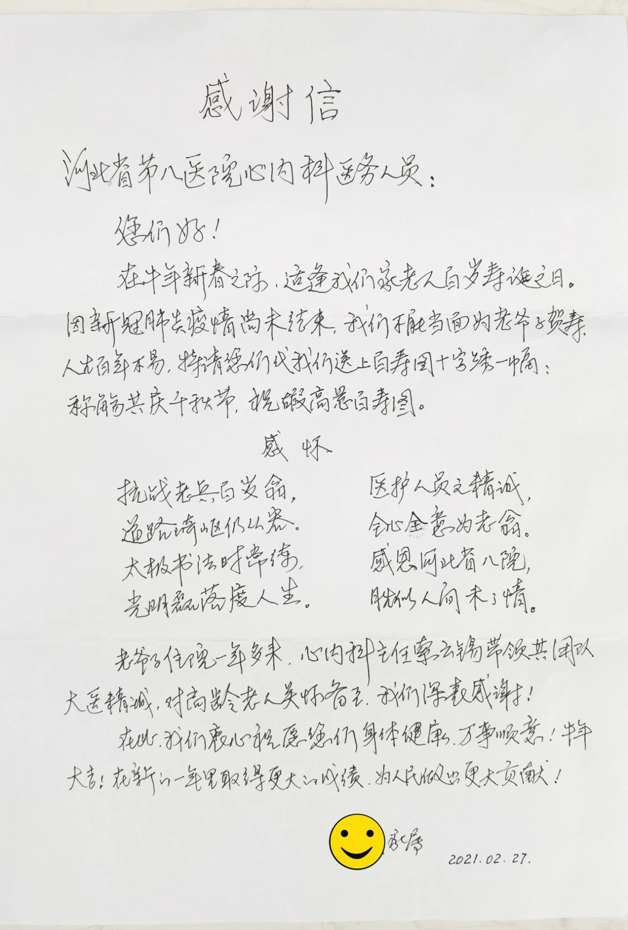 2月28日清晨,河北省第八人民医院(河北省老年病医院)心内二科病区医护人员正在井然有序忙碌着,电话铃声响起,原来是10床王爷爷的家属打来的:“今天是我们家老爷子的百岁寿诞日,疫情防控有要求,我们做儿女的不能到医院给老爷子当面贺寿了,我们给老人准备了一幅百寿图十字绣,放在导医台了,烦请你们转给老人。还有一封感谢信,感谢医护人员对老人的悉心照料,谢谢了!”