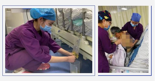 12时30分 整理好新转入患者的治疗后,又轮到口腔护理、会阴护理等基础护理时间:气囊压测量、鼻肠管冲管、深静脉冲管、鼻胃管查看胃排空。
