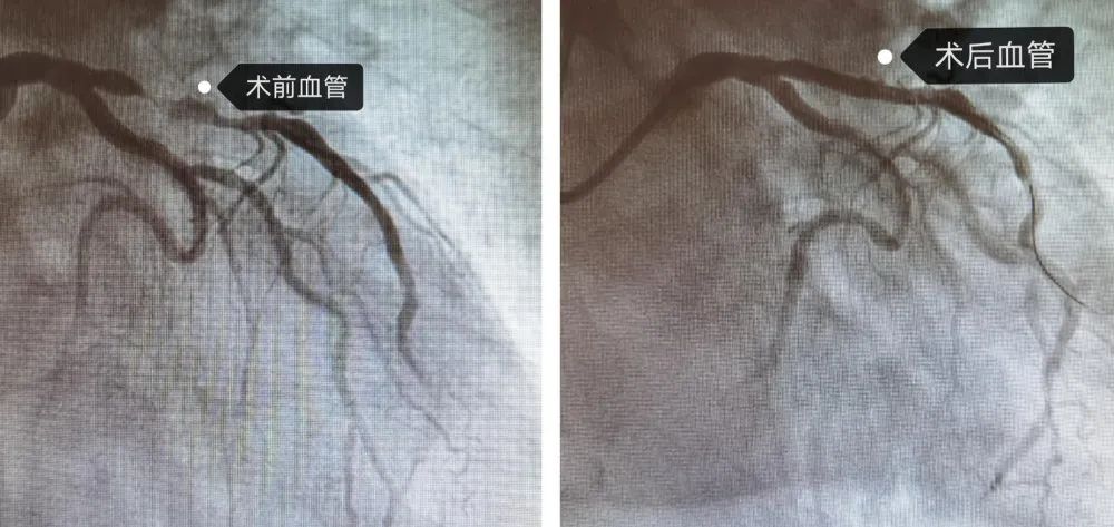 5月27日,张新勇如约而至,与心内二科专家一起为袁老先生进行了冠状动脉介入治疗。术中冠状动脉造影检查显示,袁老先生左侧冠脉血管前降支近段可见弥漫性狭窄,最严重的可达99%,经过认真评估后,顺利为其行冠脉支架植入术。术后,袁老先生胸闷、胸痛及活动后气短等不适症状消失,老人和家属对治疗效果十分满意。