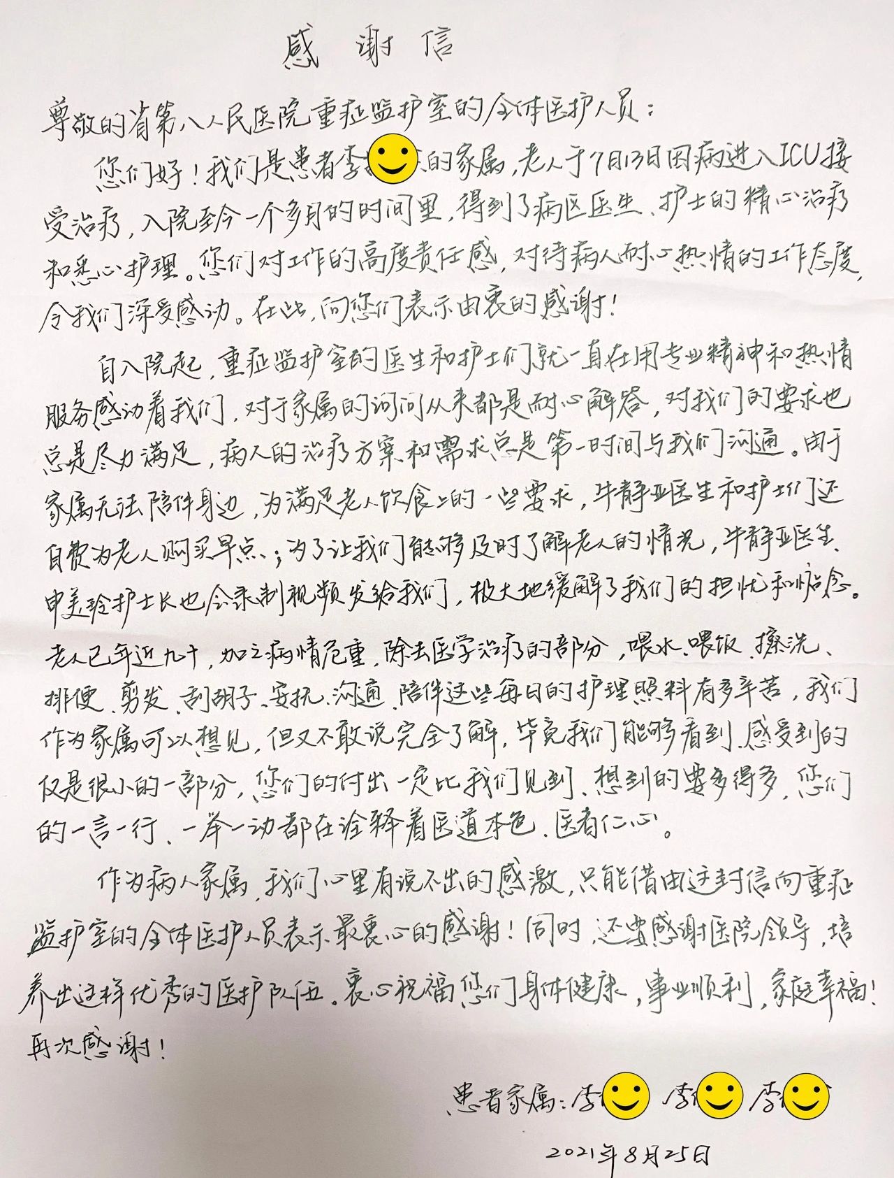 感谢信中写道:“自老人入院起,重症监护室的医生和护士就用专业的精神和热情服务感动着我们,他们对家属的询问从来都是耐心解答,对我们的要求总是尽力满足。老人的治疗方案和需求第一时间会和我们沟通。由于家属不能陪伴在身边,为满足老人的要求,牛静亚医生和护士们还自费为老人买早点,为让我们及时了解老人情况,他们会录制视频发给我们,极大的缓解了我们的担忧和惦念。他们的一言一行无不诠释着医道本色、医者仁心。”