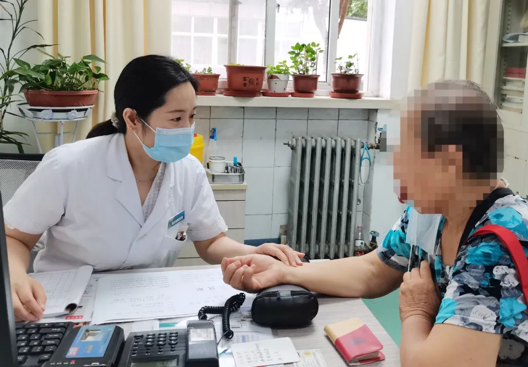 医师崔雪琴为患者看诊把脉,开具贴敷穴位处方