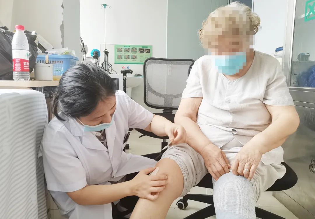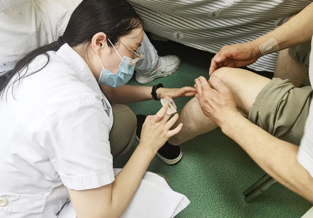 医师李红敏在病区为尹奶奶贴敷治疗膝关节疼痛的三伏贴