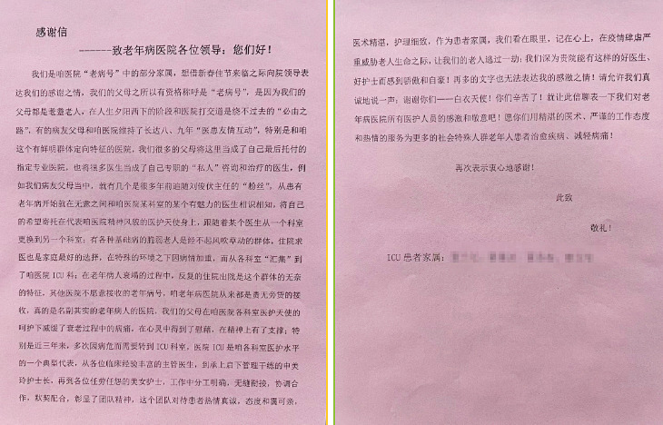 他们在信中写到,近年来,老人多次因病重转入监护室,在这里,医术精湛的主管医生,细心干练、任劳任怨的美女护士,每个人都让他们终生难忘。医护团队分工明确、无缝衔接、默契配合,对待患者热情真诚、和蔼可亲,作为患者家属,他们看在眼里,记在心上,再多的文字也无法表达感激之情……