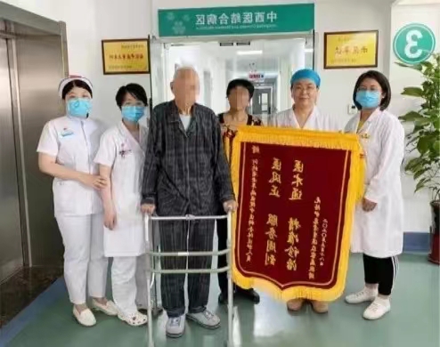 ◆ 李爷爷因急性上消化道出血、重度贫血到“无陪护”病区住院治疗,出院前,家属送来锦旗向“无陪护”病区医护人员致谢