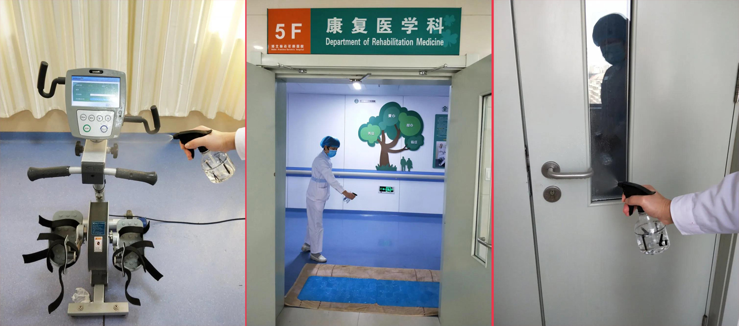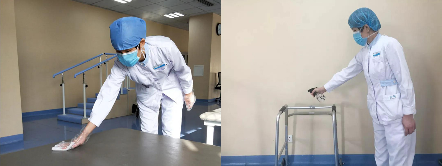 楼道里放置速干手消毒剂,每天对进行治疗区紫外线消毒,康复训练器械、物理治疗仪,一人一用一消毒;脚垫、鞋底,卫生间、洗手池、墩布……不放过任何一个卫生死角。