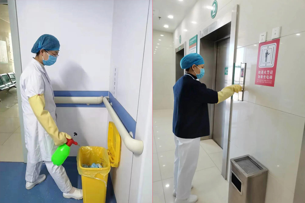 保证医院重点部门消毒工作落实到位,也是防控疫情的关键。护理部5名工作人员分工协作,每天不定时到发热门诊、留观室、隔离病房、病区、相关科室、食堂、电梯间等重点区域现场指导、监督消毒防护执行情况,对每一个流程、每一个环节根据管理要求和实际情况反复改进、不断完善,确保就诊人员、医护人员在安全的环境中放心就诊、安心工作。