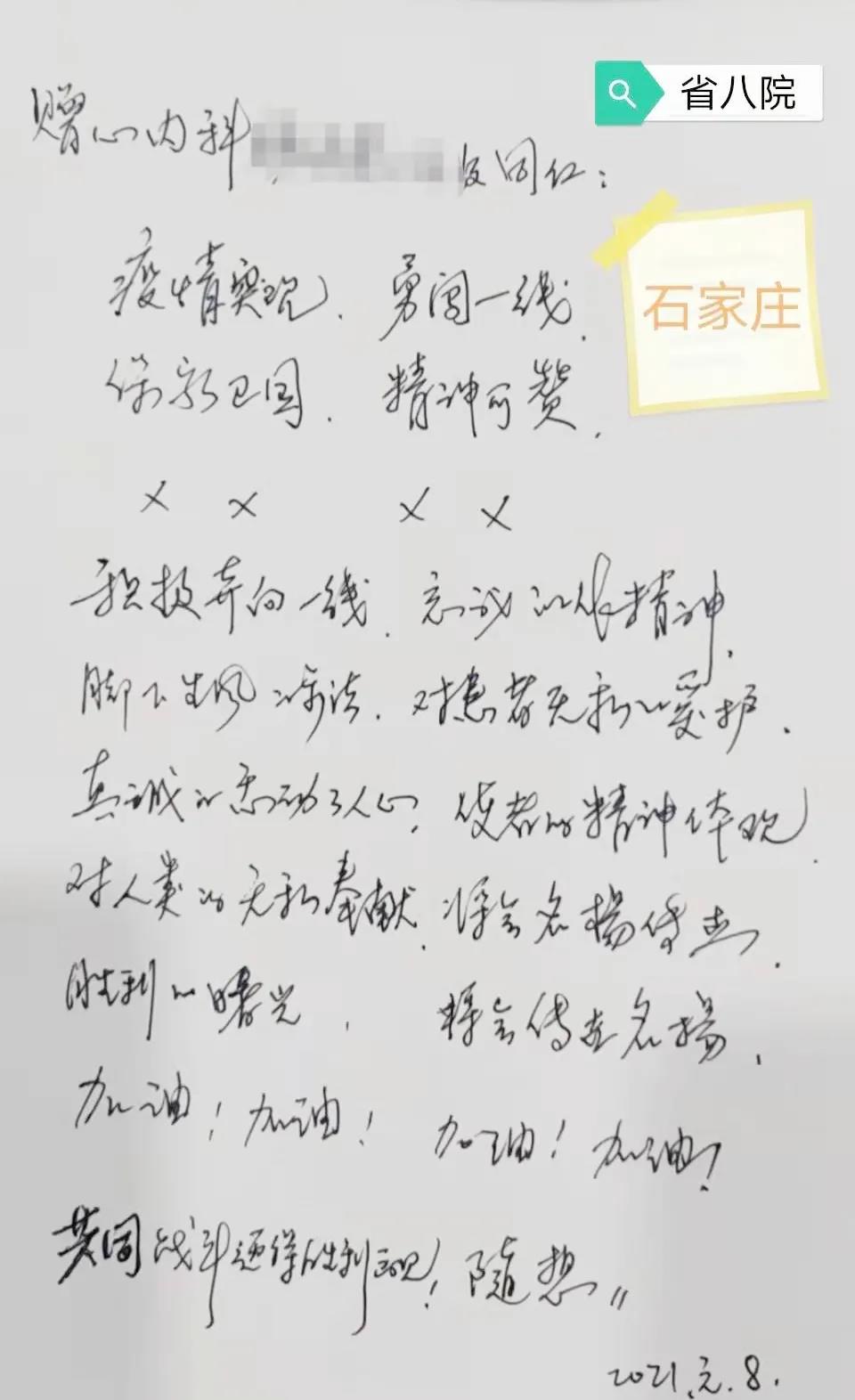 一位正在河北省第八人民医院(河北省老年病医院)住院的患者赋诗一首,表达与医护人员共同战斗、迎接胜利的决心