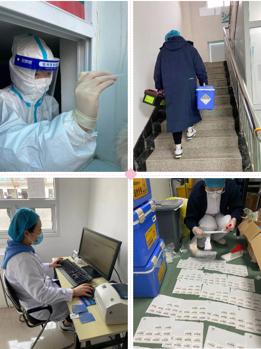 春节前后,随着返乡人员和复工复产人员增多,医院核酸检测任务急剧增加,每天要检测1千人左右,最高峰时,前来检测人员达到3000余人。打印条码,核酸采集,信息录入,送检标本,核对受检人员信息,数据上报……门急诊专门抽调出6名“美小护”,轮班迎战核酸检测任务。虽然检测高峰时,医院统一部署增设了5个核酸采样点,并从各科室抽调精英护士前来“助战”采集,但门急诊的护理人员依然非常忙碌。完成一天的采集工作,还要上报当天的核酸采集数据,白天工作忙,数据核对整理不完,晚上就带回家继续核对整理。刘晓敏孩子才1岁多,为了不影响工作,就把孩子交给老人带,还动员家人帮着一起录。由于劳累,马倩和马蕾这两个“女汉子”,一个感冒了,一个肩周炎复发,她们居然没请一天假,硬是抗了下来。大家常常加班到凌晨二三点钟,第二天7点半,又准时出现在岗位上,穿戴好防护服、护目镜、口罩、手套,开始一天的繁忙工作。