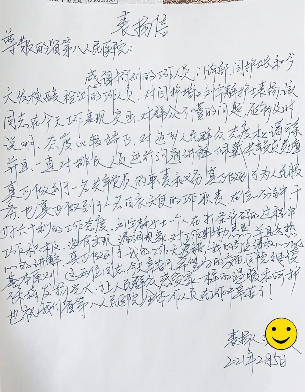 前来检测的人多,排队时间一长,大家难免有情绪。一位年轻的小伙子感觉排队时间长,开始变得烦躁,对着正在维持秩序的闫志学不停地大声抱怨,周围的人也表露出不满情绪。闫志学耐心解释,还领着小伙子参观每一个环节,并进行计时,小伙子惊奇地发现,每个人员完成采集时间是26秒,如果加上录入信息、打印条码这些程序,一个人的采集时间平均1分20秒,这样的速度让他惊讶,看着忙碌的医护人员,愧疚及敬佩之情油然而生。临走时,他特意到党办室写下了表扬信,感谢医护人员的辛苦付出。