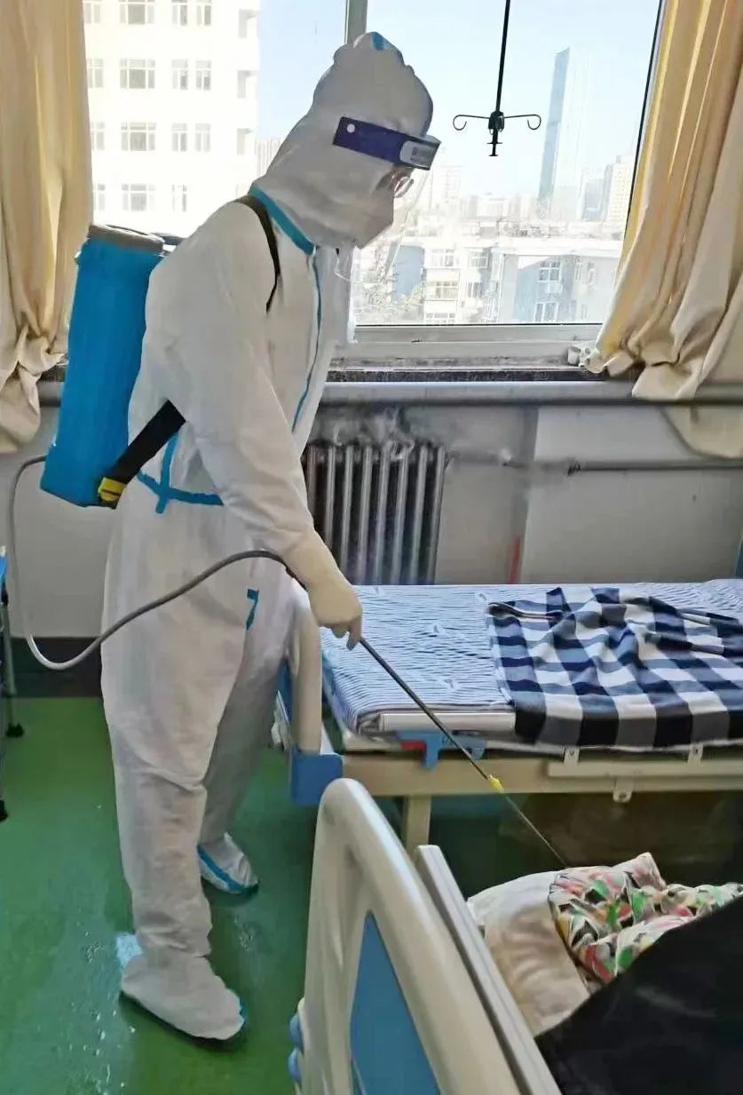 11月9日,新一轮疫情席卷而来,全科医疗/肿瘤科进入闭环管理,为有效切断病毒传播途径,全力保障患者和医护人员生命安全,全科医护人员坚持对病区环境进行全面消杀。每天早上,科主任杨智晖都全副武装,背着15公斤重的消杀喷雾器走遍病区的角角落落,其他医护人员也都认真擦拭床头桌、门把手等高频接触地方,进行无死角“地毯”式消杀。