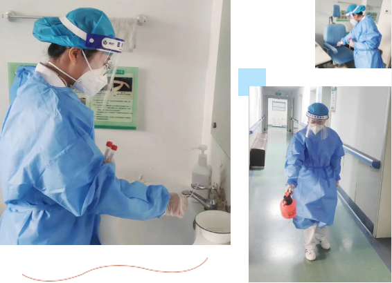 李思璇还是医院“消杀小队”成员,哪里有情况,哪里就有“消杀小队”。无论白天还是夜晚,一声令下,她们即刻出发,第一时间对危险区域进行消毒。消毒是个细致活儿,也是个体力活儿。除了桌面、开关、门把手等显而易见的地方,还有床底、柜子和抽屉,每一个角落都不能放过。为了安全,也为了保护精密仪器,不能直接喷洒酒精时,她们就使用酒精湿巾逐一擦拭,酒精和84消毒液的味道,就是属于她们的战场“硝烟”。
