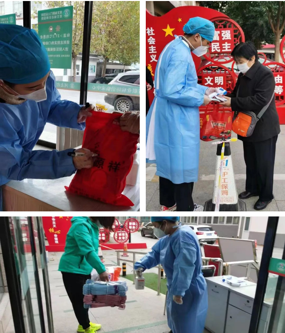 疫情坚守,践行医者誓言。预检分诊工作繁杂,不仅要把好入院人员关,还要把好所有入院物资关,对物资进行消毒、登记,再通知相关部门领取,人员不足,工作量大,大家常常放弃休息时间连轴转。每天的门诊、大厅消杀,需要配备几十桶消毒液,门诊部工作人员带上手套,认真消杀,不放过任何角落。