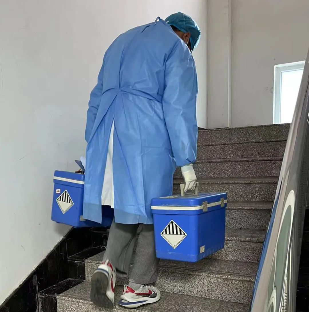 收取核酸标本看似简单,背后却是从不停歇的脚步。每天,门诊部工作人员都要到各病区收取核酸标本,整理好后,再爬楼梯送到位于5楼的检验科。从收取到整理,再步行至5楼,一天最少15趟,相当于爬75层楼,忙碌的身影在医院穿梭,全然不顾早已湿透的衣衫。