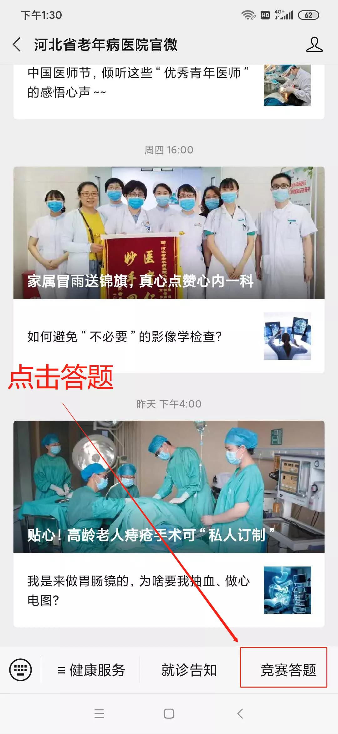 1.如您没有关注我们,请先在微信搜索“河北省老年病医院官微”公众号,关注后,点击菜单栏“竞赛答题”