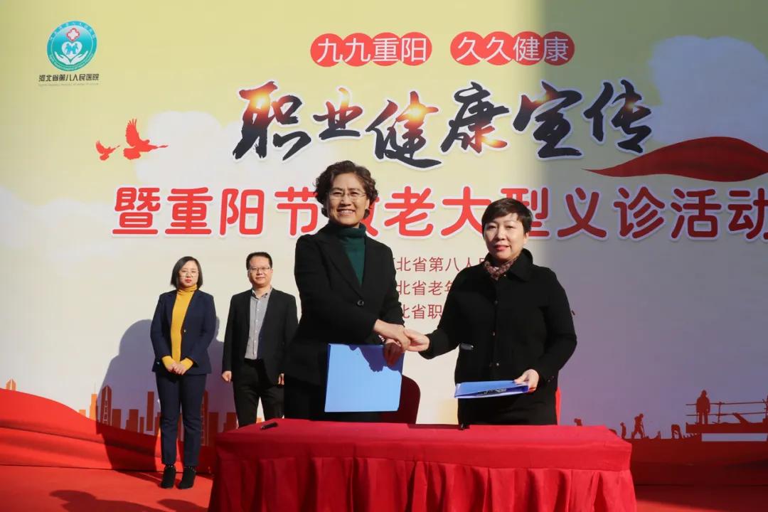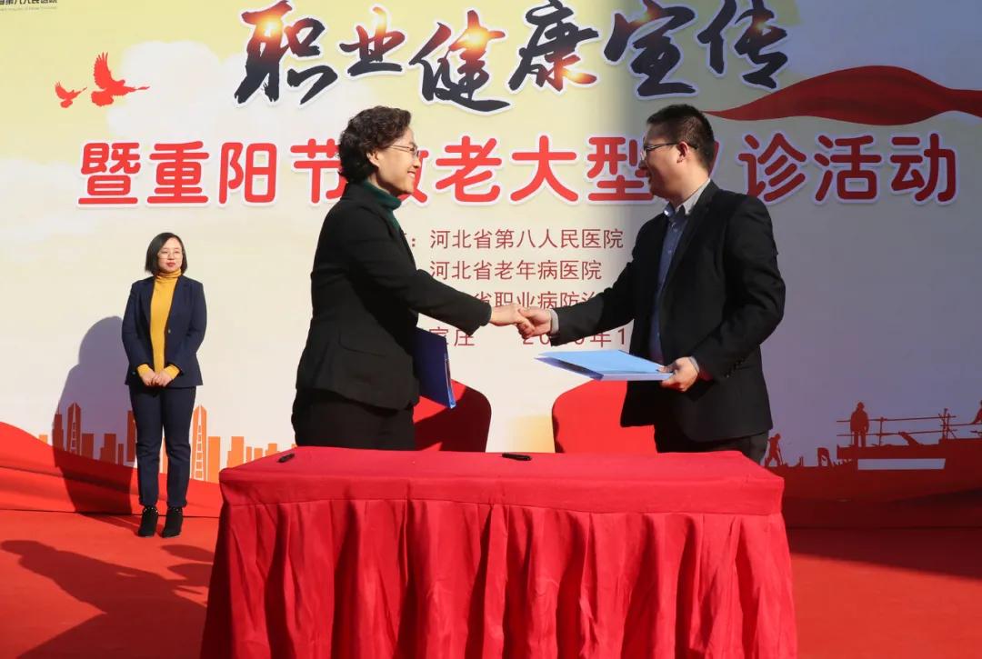 现场举行医养结合联合体续签约仪式,河北省第八人民医院(河北省老年病医院、河北省职业病防治临床中心)院长马爱军与医养结合联合体成员单位代表握手相约。
